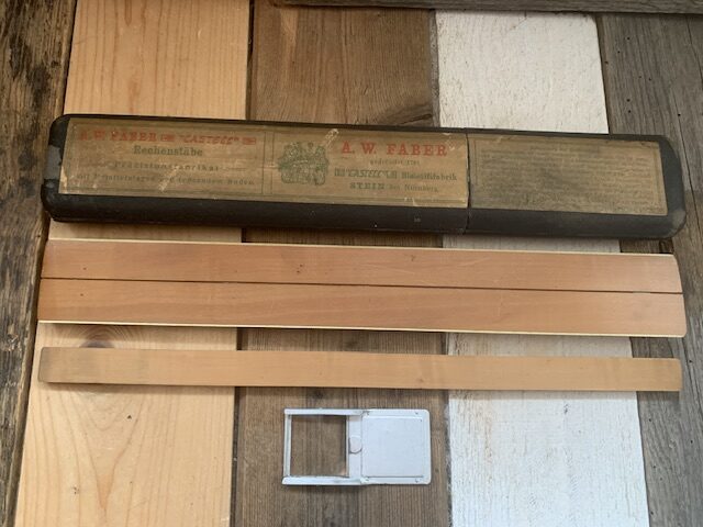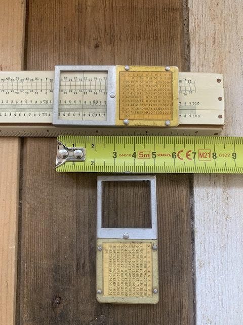 Sometimes items find me…I bought this slide rule from a bad picture. A picture taken from afar because there were 30+ slide rules in it. I mostly bought it because I noticed the cursor. Not only a strange set-up with the table joined to the window frame, but also very familiar looking. At least to me…