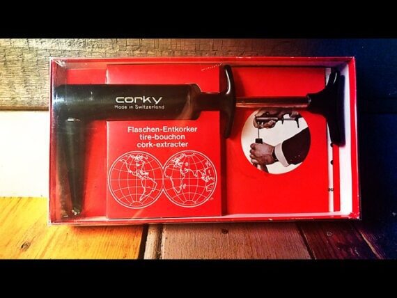 Corky wine pump opener bar man tool in the box, made ca. 1980 in Switzerland